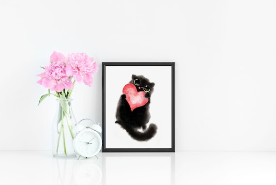Buy Black Valentine Cat With Heart Art Print Instant Download Art